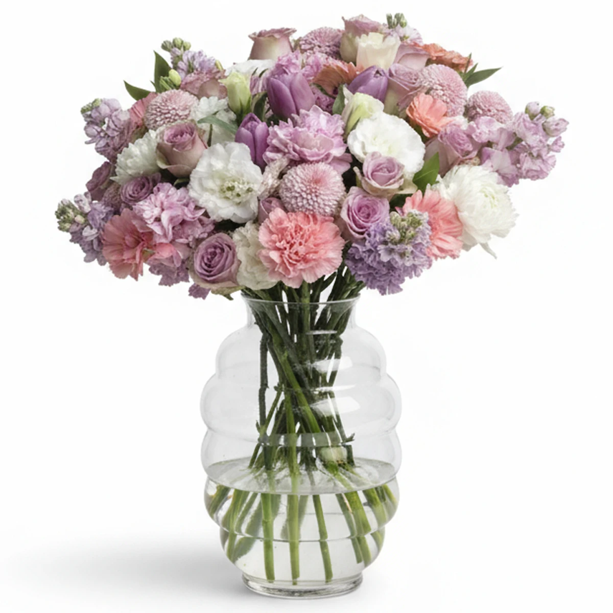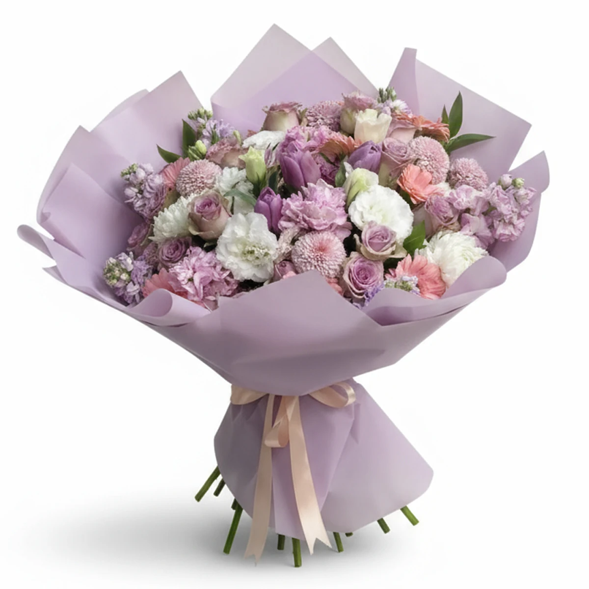 Lila buket, lila renginin asil tonlarından oluşan canlı çiçeklerin beraberliğinde sıradışı bir aranjman ortaya çıkarır. Mevsime göre bazı çiçekler tasarıma uygun şekilde değişiklik gösterebilir. Buketlerimiz özel solüsyonu sayesinde 10 güne kadar tazeliğini korur. Zevkinize göre seçeceğiniz cam vazo eşliğinde ya da vazosuz olarak tercih edilebilir.