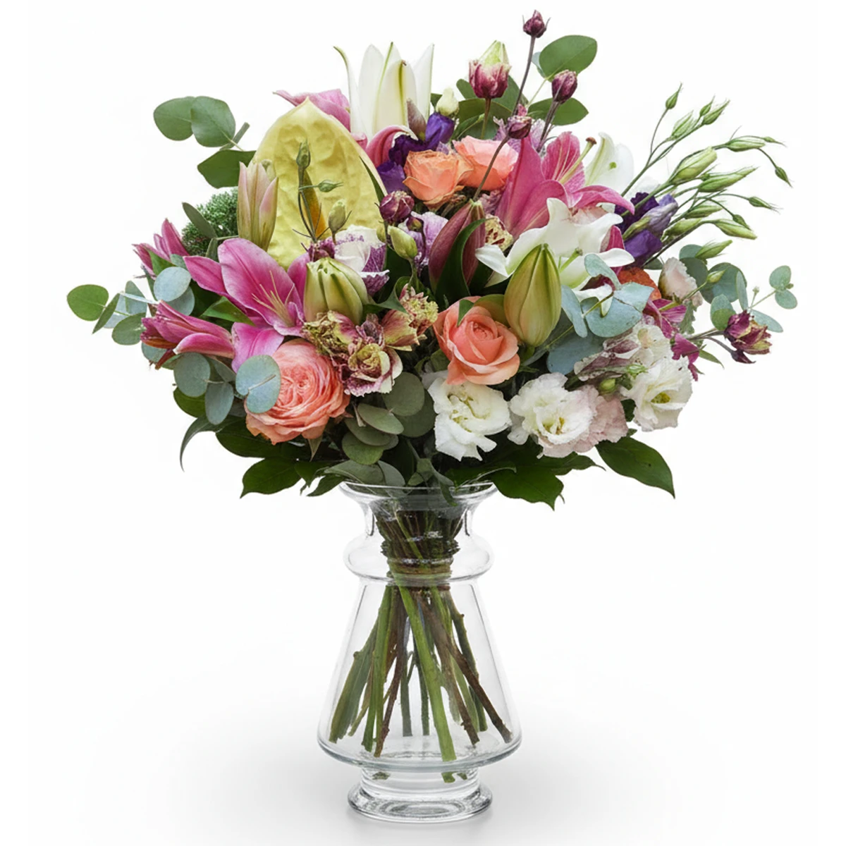 Altı farklı çiçeğin zenginliği içinde pembe cazablanca’nın asaleti el yapımı bukkette bir araya gelerek çarpıcı bir estetik sunar. Mevsime göre bazı çiçekler tasarıma uygun şekilde değişiklik gösterebilir. Buketlerimiz özel solüsyonu sayesinde 10 güne kadar tazeliğini korur. Zevkinize göre seçeceğiniz cam vazo eşliğinde ya da vazosuz olarak tercih edilebilir.