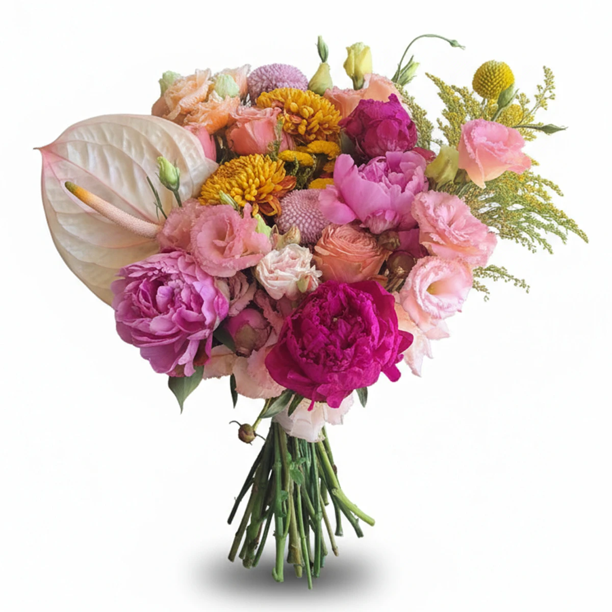 Anthoryum, şakayık, gül ve anastasia çiçeklerinin zarif uyumuyla hazırlanan pembe gelin çiçeği buketi, dramatik bir dokunuş arayan gelinler için tasarlandı. Mevsime göre bazı çiçekler tasarıma uygun şekilde değişiklik gösterebilir. Buketlerimiz özel solüsyonu sayesinde 10 güne kadar tazeliğini korur.