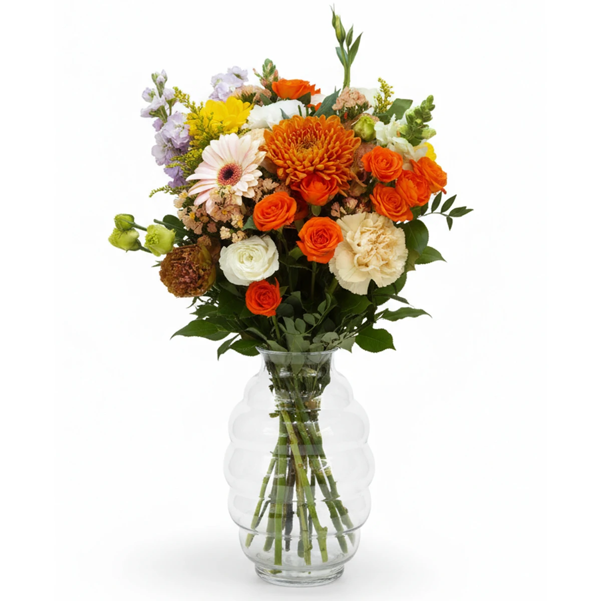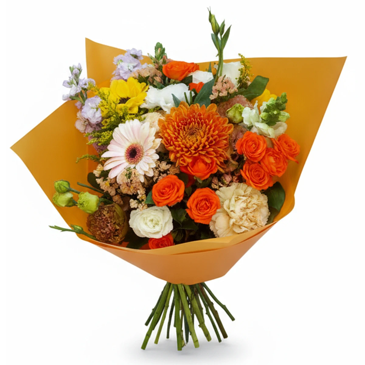 Canlı renklerin aydınlık geçişiyle hazırlanan renkli karışık çiçek buketi, en güzel anlarınıza neşenin ritmiyle eşlik eder. Mevsime göre bazı çiçekler tasarıma uygun şekilde değişiklik gösterebilir. Buketlerimiz özel solüsyonu sayesinde 10 güne kadar tazeliğini korur. Zevkinize göre seçeceğiniz cam vazo eşliğinde ya da vazosuz olarak tercih edilebilir.