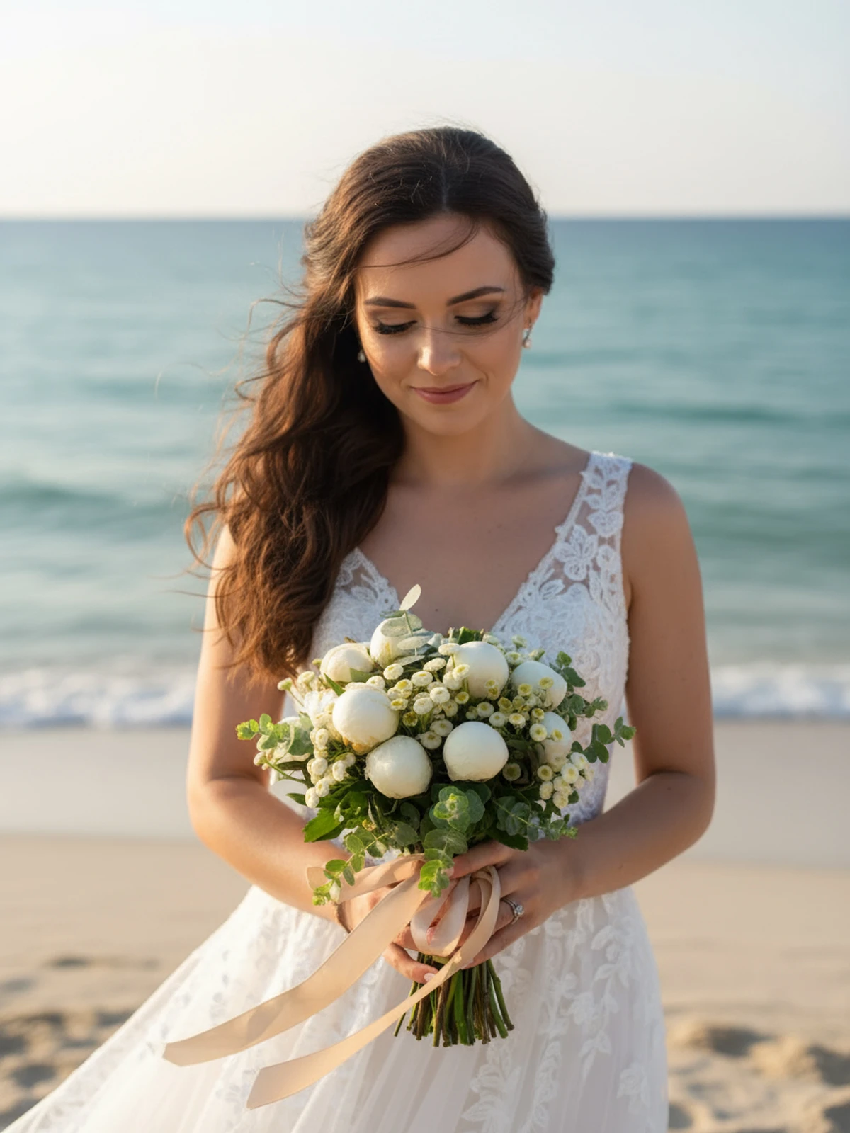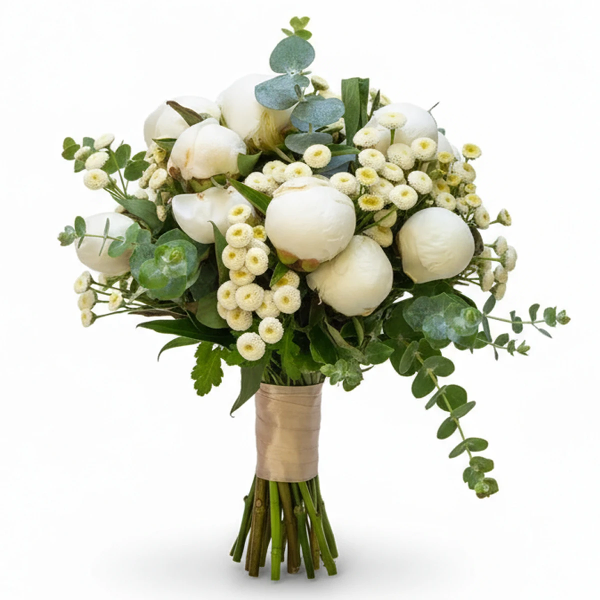 Şakayık gelin buketi, şakayık çiçeğinin asaletini yansıtır. Şakayığın ipeksi dokusuna eşlik eden krem kurdele, kompozisyonu ahenkle tamamlar. Mevsime göre bazı çiçekler tasarıma uygun şekilde değişiklik gösterebilir.