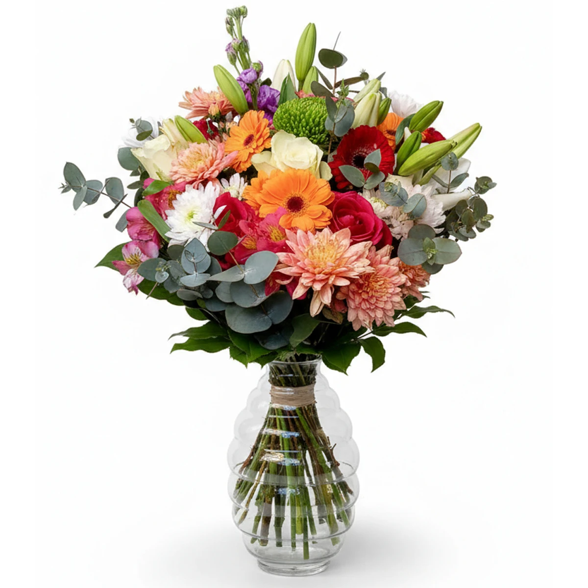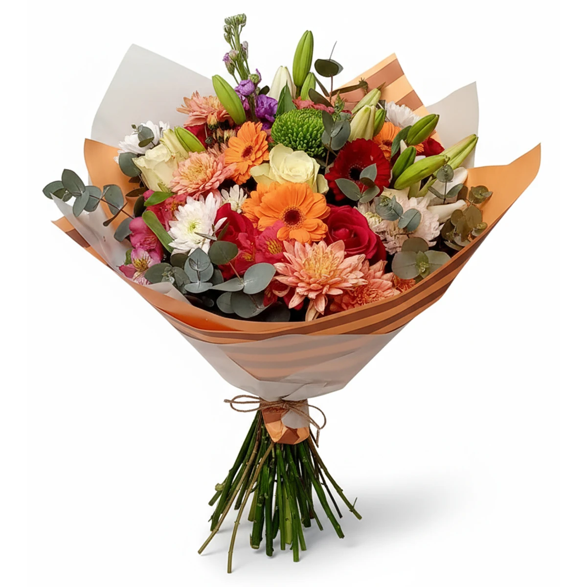Turuncu buket, yedi farklı çiçeğin dinamik uyumunu sergileyen tasarımıyla canlandırıcı bir etki uyandırır. Mevsime göre bazı çiçekler tasarıma uygun şekilde değişiklik gösterebilir. Buketlerimiz özel solüsyonu sayesinde 10 güne kadar tazeliğini korur. Zevkinize göre seçeceğiniz cam vazo eşliğinde ya da vazosuz olarak tercih edilebilir.